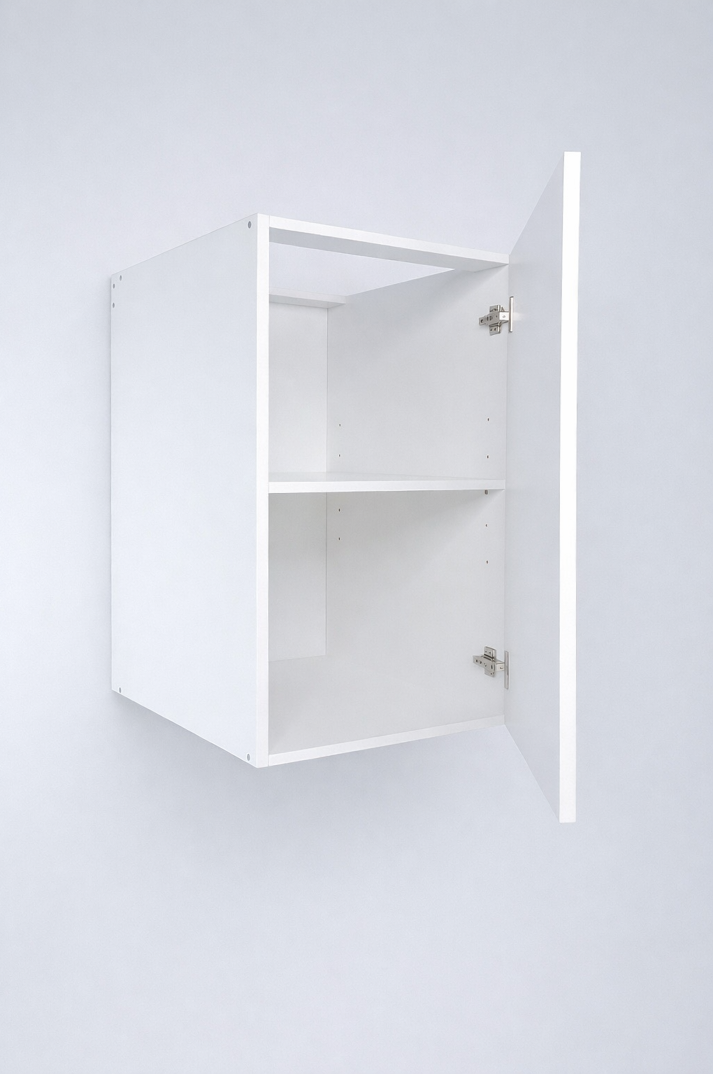 Gabinete suspendido con puertas, fabricado en melamina blanca de 15 mm con tapacanto de 2 mm. sin fondo para tuberías, bisagras con cierre suave y apertura push-open. Incluye entrepaño ajustable y herrajes para ensamblaje. NO INCLUYE INSTALACIÓN